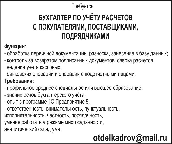 • Ваше объявление должно быть удобно для чтения, а именно: сам шрифт, его размер, объем информации сопоставим с размером объявления. Помните, что цель вашего объявления это звонок соискателя. Вам нужно его привлечь, а детали вы обсудите по телефону или при личном интервью.